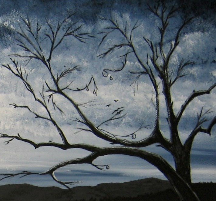 Unique and atmospheric painting. The weeping tree, an image or similar seen elsewhere, I thought captured the mood I was trying to convey in this piece. I have adapted the image for this painting.